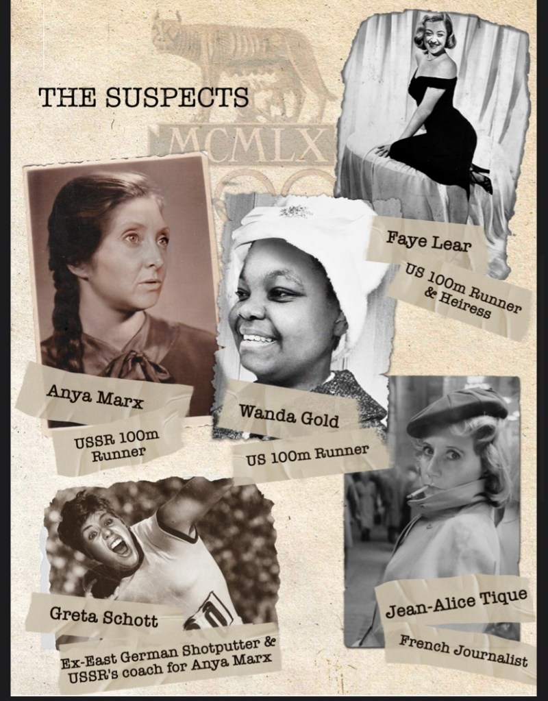 Sherlock In Holmes 3- murder at the games’ is set in 1960 just after countries from all over the world have competed in the Olympic Games which was in Rome. After everyone else had left to watch a fabulous fireworks display, it was discovered that Brad Mitten had been found dead after being locked in a sauna Pod. This means that the six Olympians who did not attend the fireworks are the possible suspects and the audience have to figure out who it was! To start the call everyone is put into one big lobby which is hosted by Sir Stanley Shartington who introduces the evening and explains how the night will work. This character also reminds everyone about the key information that was in their case files in case anyone was not able to see them. The viewers are then split into smaller groups where they will meet each of the characters and can ask them questions to figure out any clues, motives or information that could help to solve the case. The experience of this show (which is a collaboration between Sharp Teeth Theatre and The Wardrobe Theatre) started a few days before I actually sat down on zoom on the 2nd of December as they sent out important information about the show including case files about the suspects we were going to meet. The team working on every one of these productions clearly work hard to ensure that every little detail of the show is well thought out and meticulously planned as they send out this information which is formatted as if they are genuine case files with suspect information and a map of the scene of the crime. Within this email was also instructions on how to use zoom which I have to admit that this time I was very great full about as I have not used zoom since online teaching was stopped hear in the UK. I thought that it was absolutely brilliant that so much effort was put into the preparation materials but also that every single character had themed costume, backgrounds and props which helped bring the viewers into the fictional world in which the murder had taken place!