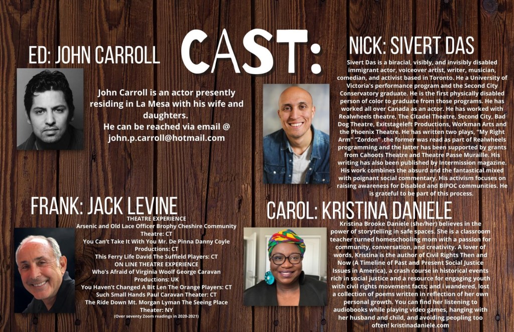 This experience took on the form of a first reading of a new version of this play and so all of the performative elements were stripped back. Similar to my experience with the power of o (with the review available at https://rhysreviews.com/2022/07/09/the-power-of-o-experience-review/) this was an opportunity for the creative team to receive direct feedback from the audience and gauge how the play would have been received to a live audience. With the support of virtual theatre lab, Matteo and the crowd were able to see an almost staged version of the play and to identify any improvements that needed to be made. Unlike the power of O however, this production contained a quartet of performers who each took on a different role within the show. The stage directions are read aloud so that the audience can have a greater understanding of how this play would work on stage which is particularly important consider the online format of the performance! Generally speaking, it is clear that the community of both performance and audience members are extremely close as there were conversations before the show which would have made for a great place for Matteo to showcase his work without the fear of intense criticism.