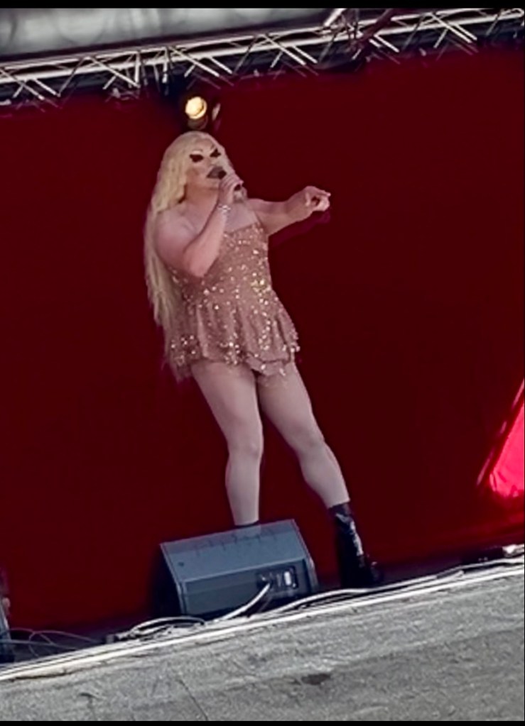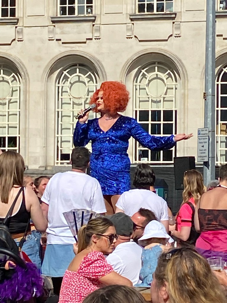 At this years pride festival there were two different stages the first being the aforementioned community stage and also the main stage. The main stage stage looked out of a large open space where hoards of people laid out towels (which I did not even consider bringing) to sit down and enjoy the extremely hot weather we were lucky enough to experience! There were many fabulous choirs that performed in the main stage but I do have to say that my favourite was absolutely the South Wales Gay Men’s chorus who delivered many energetic and vibrant numbers and in particular their rendition of “It’s raining men” was vocally incredible but also really helped to energise the audience! If this choir sounds like something you would be interested in then the group is hosting an opening evening on the 22nd of September at Roath Church House and you can find more information at https://swgmc.co.uk. This festival also helped me to discover a new artist that I am going to add to my travelling to work playlist! The amazing James Willets showcased a high energy performance where he graced the main stage and delivered some of his fantastic original songs including my personal favourite “You don’t know love” (available on Spotify) that had the audience shouting love that, when you think about it, was a very simple yet powerful motto to be shouted at Pride! Almost a year ago we attended our first ever drag show starring Utica and Denali from Ru Paul’s drag race season thirteen (which you can read our thoughts in at https://rhysreviews.com/2021/09/22/denali-and-utica-tour-review/) and was hosted by none other than the iconic Jolene Dover. She delivered a plethora of pop icons with her rendition of Bonkers by Van Helden and Dizzee Rascal being a particular crowd pleaser with people jumping in the air and shouting the unique lyrics! Jolene clearly has a fantastic stage presence where she used every each of stage during her performance which made for a very entertaining set!