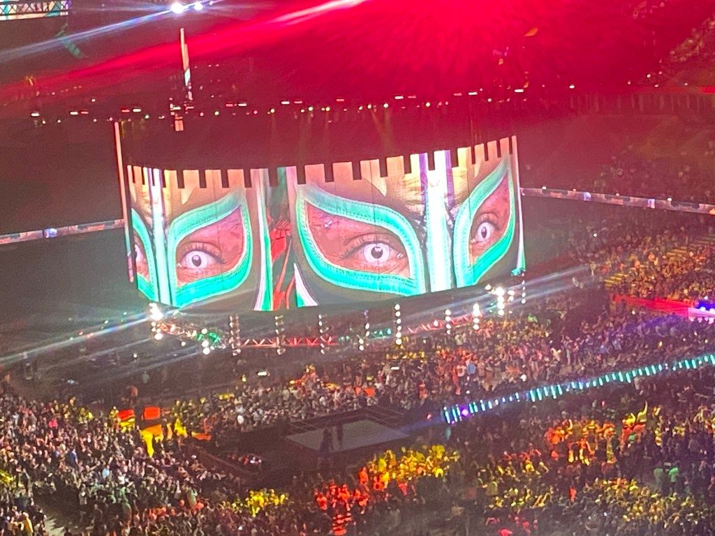 I have already discussed how the wrestlers were able to conjure thunderous reactions from every member of the audience (regardless of how far back in the venue they are sat) but there are the odd occasions where it is impossible to orally predict how the audition we’re going to respond to what they are seeing. During a six-person tag match between Bianca Belair, Asuka and Alexia bliss vs Bayley, Dakota Kai, and IYO SKY who are now known as damage control. Despite being the heels (or baddies) of the match the audience show incredible love for Bayley even starting a “Hey, Hey, Bayley oh ah! I want to know if you’ll be my girl” chant in the tune of Hey Baby by DJ Ötzi which was hilarious! I think it is incredible that wrestling icons such as Edge and Rey Mysterio still keeping up with the younger wrestlers as these were some of my favourites when I was a child. The fact that these two are still at the top of the game despite having just over sixty years of experience in the WWE between them! The crowd went absolutely crazy for both these icons when they were walking to the ring as they battled the team of Finn Balor and Damien Priest where Edge and Rey showed that they can still keep up with the younger guys! I think some praise needs to be given to Seth Rollins who walked to the ring in a brilliant Elton John-inspired devil outfit worn in the movie Rocketman (which made sense as he was the bad guy in his rivalry) where he faced fan favourite, Matt Riddle! My personal favourite match of the card however would have to be Sheamus vs Gunther for the universal championship. This was an intense match crammed full of hard-hitting moments that came to an end after both faced off visibly exhausted with one hitting a very powerfully strike to bring the match to a definitive end!