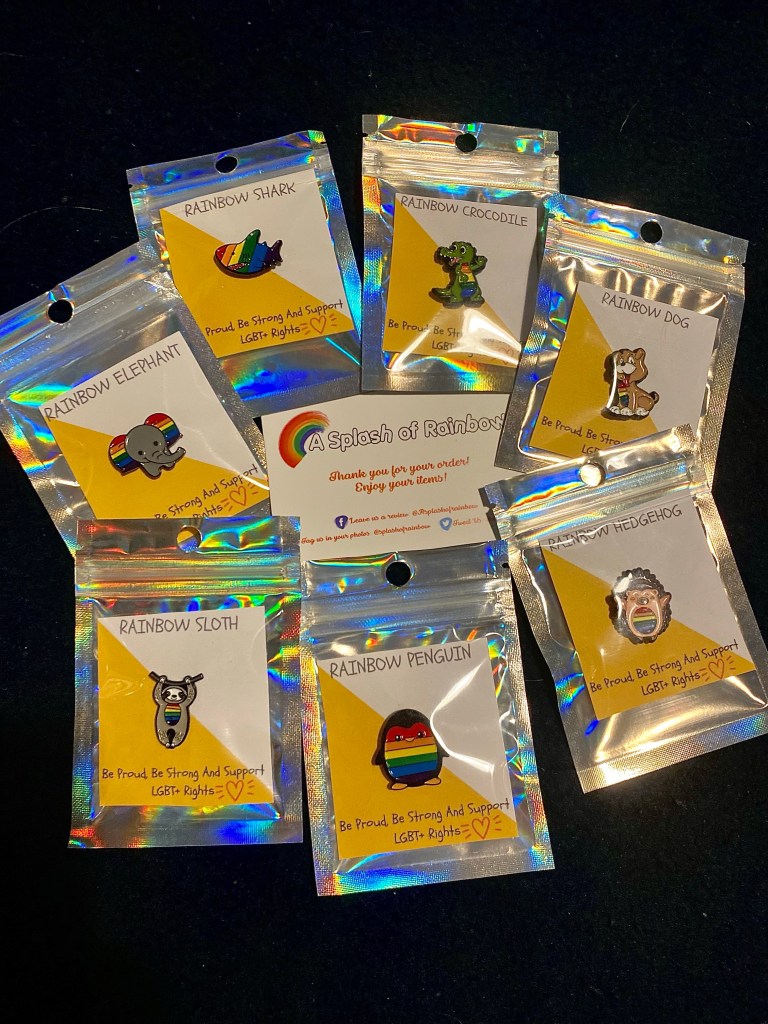 This past summer we took part in what can only be described as a mini international pride tour that covered a London event hosted by the fabulous Mama G (with our review available at https://rhysreviews.com/2022/06/27/mama-g-family-pride-event-number-two/), the incredibly political Budapest pride (which you can read about at https://rhysreviews.com/2022/07/26/hungary-2022-part-one/) and the highly anticipated return of Pride Cymru (which you can read on thoughts on at https://rhysreviews.com/2022/08/28/pride-cymru-2022-experience-review/.) While these events are wonderfully fun In an ideal world however we would not need to have specified pride as we should not just celebrate being ourselves on select days it should become an everyday practice. This is why items such as our recent order of items from A splash of rainbow are so important as they are a way to celebrate pride every day as well as supporting a queer-friendly small business! For the low price of just £24 (including postage) for seven adorable enamel pins, these pride reminders come at just over £3 a pin which is a bargain! Our recent order could really be split into two categories one of which is the more subtly pride-infused pins and then the more bold, rainbow-plastered ones.
