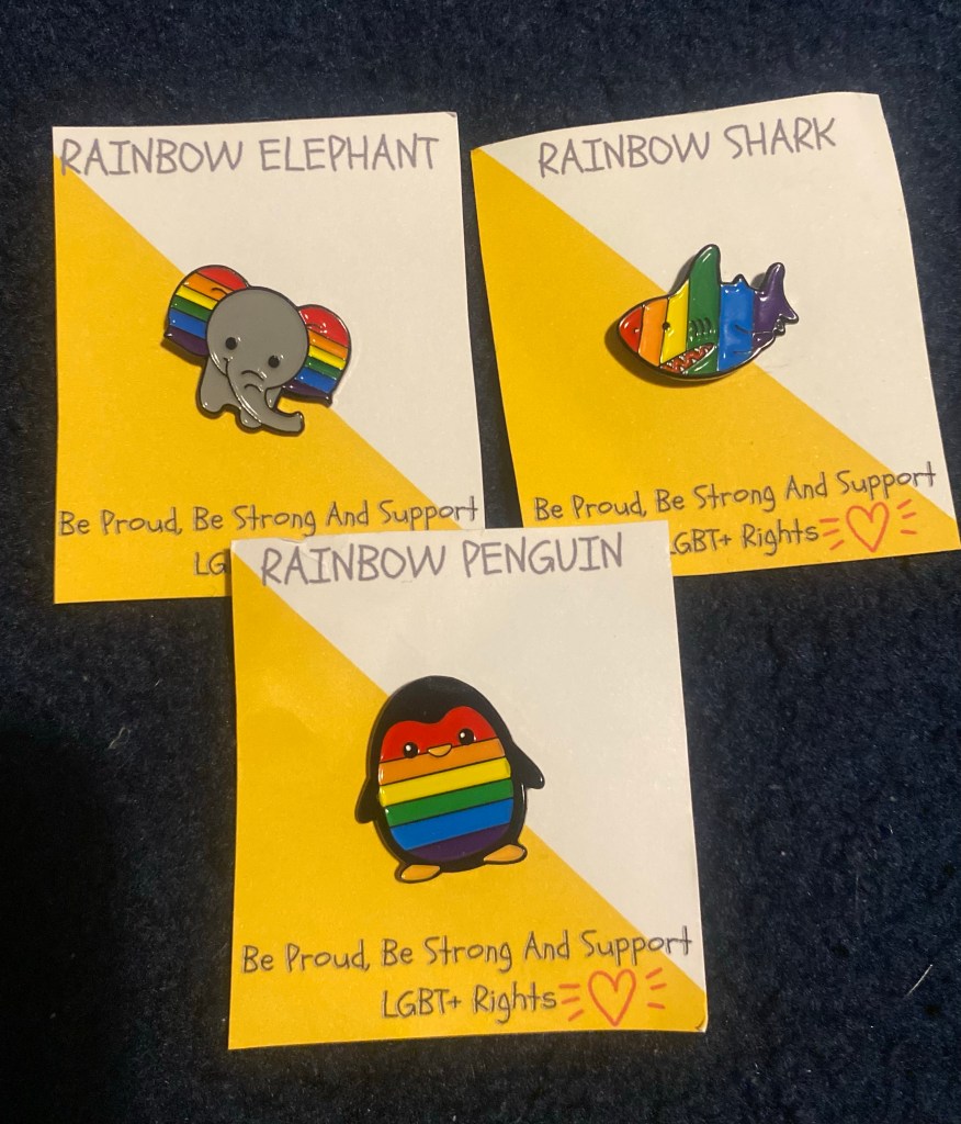 What is particularly interesting about these designs is the fact that they appear to be catered to a much younger audience which is a very controversial topic at the moment. The integration of queer culture and young children is a relationship that has recently come under fire by the media but having worked in schools that have had extremely vibrant LGBT+ societies it is clear that there is an outcry for queer children to receive the support and advice they need in order to live their lives freely and authentically! As an educator, the most important thing is that children feel safe and secure not only in my care but also within their homes so these classes/groups/communities are so important! The first collection are much more obvious with their association with pride and so would be perfect for pride-specific celebrations! Among these pins, I would have to say my favourite was the elephant pin that has massive rainbow ears on either side of his adorable trunk! I think that it was a clever choice to use the ears as the canvas for the rainbow inclusion as it not only provides a larger space but a rainbow trunk could have conjured up unwanted sexual innuendos for the product! When I discovered that there was a rainbow shark available on A splash of Rainbow’s website, I knew I had to order it as there is a joke about a gay shark that I have told to anyone who stands still long enough! Not only is this a super cute pin but it is also now become an opportunity to share one of my all-time favourite jokes so if you see me wearing this rainbow shark pin at an event please ask me about the joke as I would love to share it with whoever! I also thought that the rainbow penguin was also very cute!