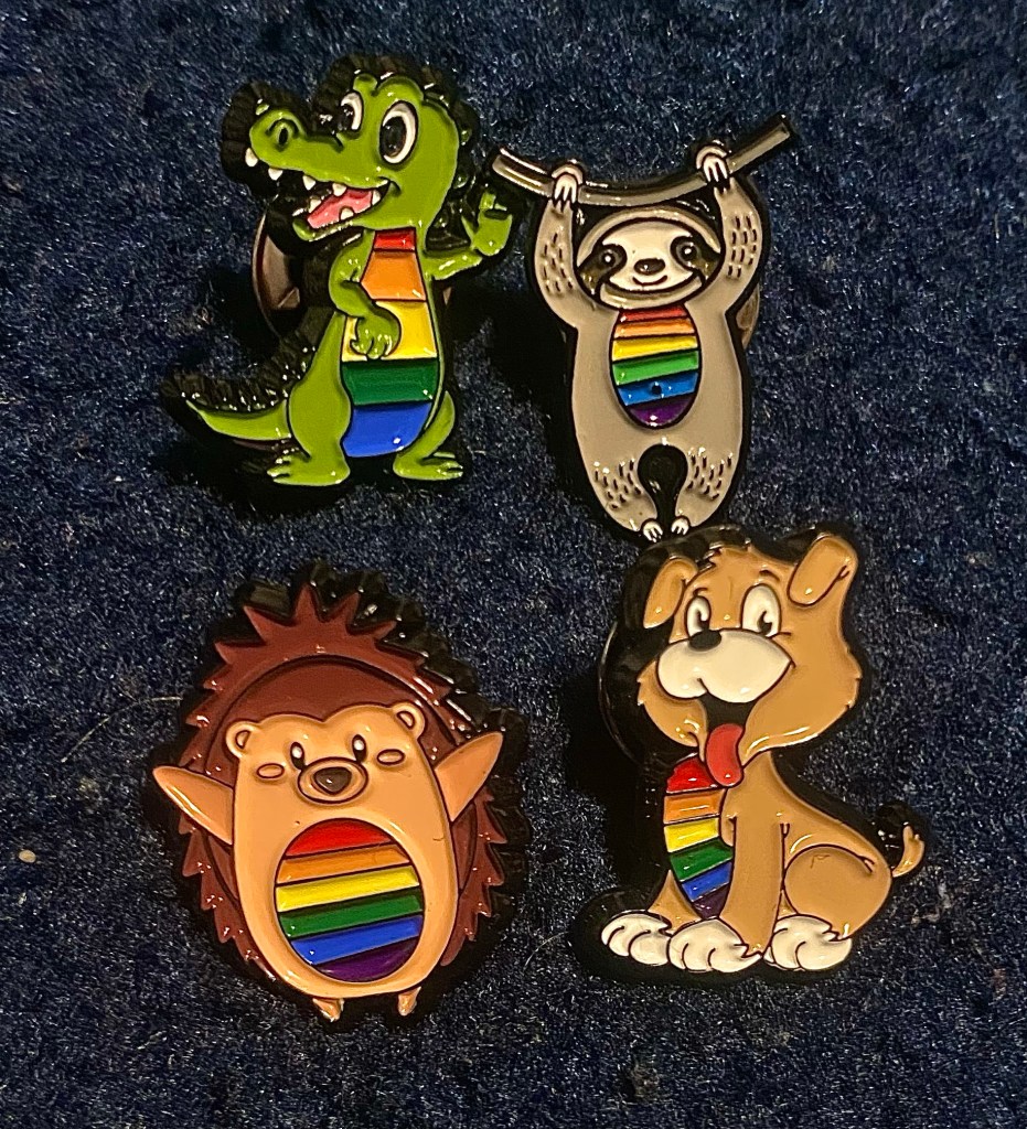 The second set would be perfect for the likes of youth workers, teachers etc who are encouraged by superiors to not be seen promoting any political ideology or a place where it could be potentially dangerous to disclose your sexuality as these items are subtle enough that without close inspection people who not assume are pride items! My particular favourite in this pseudo-collection would have to be the adorably cute puppy pins that has rainbows strips going through the inner section of its belly. What really strikes me about this pin, in particular, is the vibrant colours of both the rainbow itself but also the fur of the dog that somehow adds a wonderful amount of energy to the totally stationary pin! The fact that this pin is modelled with having its tongue out really adds to the playful and fun energy of the product. While this is my favourite in this group, the crocodile pin is a very close second! The designer of these pins has managed to present a much more friendly and approachable depiction of a crocodile which are famously known for being violent and vicious creatures in the real world! Again the choice of an almost like green, the big eyes and their waving hand help to make this pin extremely fun and likeable. Alongside the hedgehog and sloth, these pins make up the sort of line-up you of characters would see being brought to life during a Butlins/Pontins pride celebration!