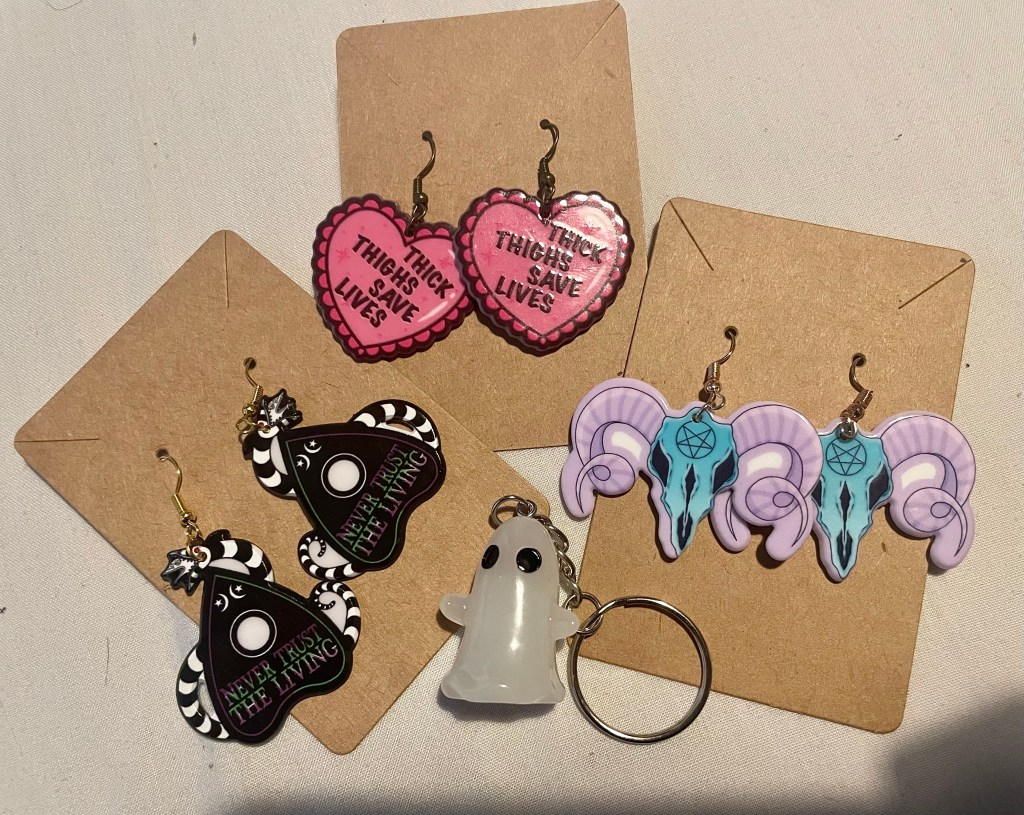 From earrings that battle against dated gender roles to a pair that aim to battle against the rise fat phobia. In my deliver I was also sent a pair of bright pink love hearts that shares the message “thick thighs saves lives” which was popularised by model Ashley Graham. Those who have followed my blog for a while will know that I am an advocate of body positivity and In fact was actually interviewed about the importance of male positivity for men (which you can read about at https://cadicinnamon1.wixsite.com/letsbecandid/post/male-body-image) and so having a pair of earrings that promotes this important message is so important for me!Also within this package was an adorable cute ghost keyring that actually glows in the dark! For what is a very simple design , these products are so cute and will help to carry a bit of the spooky season with you where ever you go!