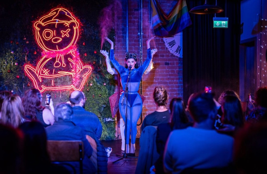 Over the last couple of years, I have been lucky enough the experience a plethora of unique ways to welcome the festive season! From drag queens singing carols in St Andrews church (which you can read about https://rhysreviews.com/2023/11/19/del-lightful-debuts-performance-review/) to a camp and queer retelling of the iconic the lion, the Witch and the Wardrobe staring theWelsh drag icon Polly Amourous (which you can read about at Review The Lion, the B*tch and the Wardrobe, Wales Millennium Centre by Rhys Payne – Get The Chance) to a wine-fuelled virtual concert with West End star Blake Patrick Anderson (which you can read about at https://www.westendbestfriend.co.uk/news/review-blake-patrick-anderson-mulled-wine?format=amp) and this year I am starting the festive season by watching some people sensual remove items of clothing to iconic Christmas tunes! Having only seen my first ever burlesque show a mere month ago (which you can read about at https://rhysreviews.com/2023/11/19/del-lightful-debuts-performance-review/) I have very quickly been quickly obsessed with not only this art form but also the company that organises these events! I have to admit that when it was first announced that the amazing Del-Fflur productions would be hosting a festive frolics burlesque show, I could not get my head around the contradiction of Christmas being the coldest time of the year and burlesque getting metaphorically hot very quickly! The honour of hosting this sexy Christmas show was bestowed upon Tiny Rebel (where we recently saw a drag cabarette show called Hell Haus which you can read about at https://rhysreviews.com/2023/10/23/hell-haus-production-review/?) which is a fun venue that provided a private area which is perfect for the strip teasing that the performers will do!