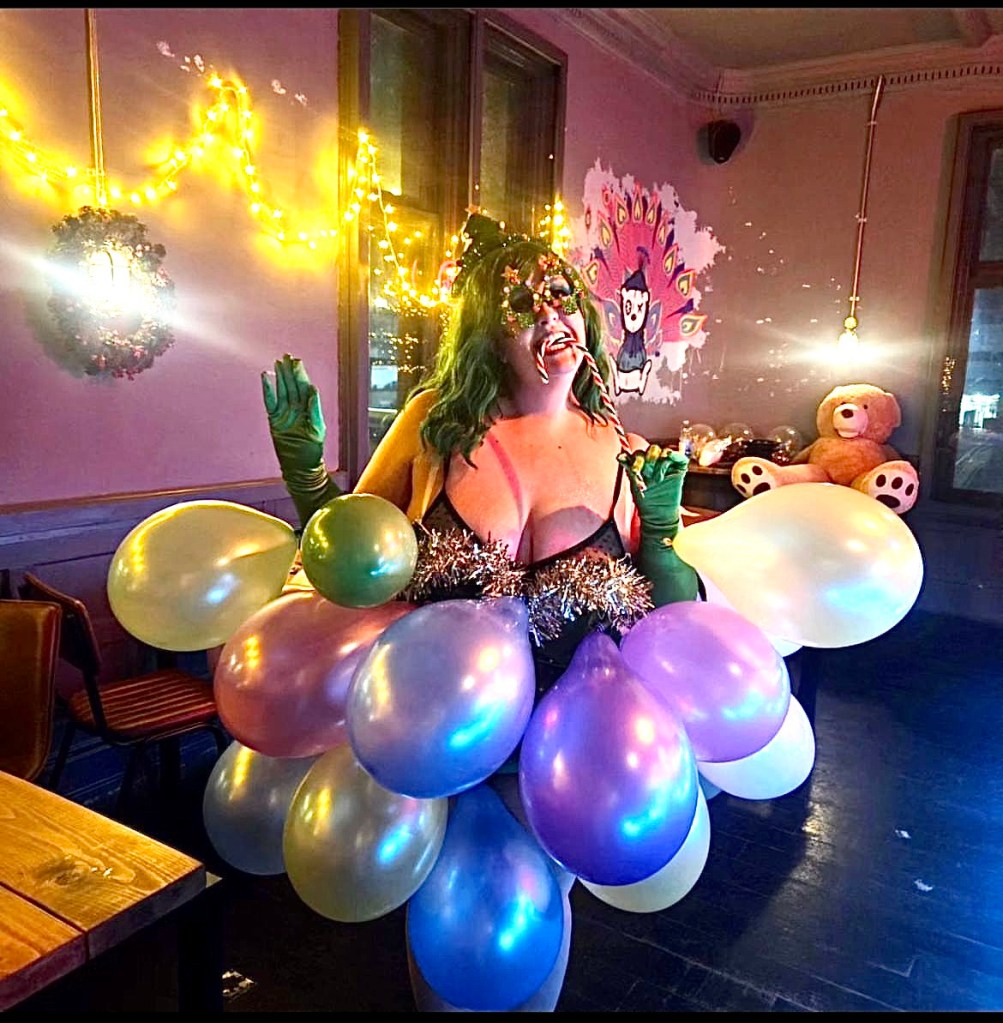 One of the most entertaining performances of the evening came from Suit Kase who graced the stage as an oversized Christmas tree with balloons dangling from every inch of the outfit. As the number progressed the performer proceeded to pop the balloons as a very unique reveal as an alternative to the traditional removal of clothes. Suit Kase was the embodiment of how I feel during the festive season covered in tinsel and a lovely green wig as rocking around the Christmas tree blasted around the venue. I thought this routine was unique, creative and extremely exciting which meant that the audience erupted every time one of the balloons was popped! Now there is this unfair stereotype that burlesque is just for women but the insane Llewelyn proved that it is an art form open to everyone! They looked absolutely stunning in a white outfit complete with a massive burgundy bow both of which he had apparently made themselves which is incredibly impressive! If there is any Christmas song that is begging to be used in a burlesque show it is Santa Baby which Llewelyn cleverly selected and looked absolutely stunning while performing! Every movement and reveal was totally mesmerising and the audience loved every single second of the performance! Later in the evening they also gave his support during Venus’s “let it go routine” and as the snow cues became more and more frantic Llewelyn was visibly confused leading to some hilarious facial reactions and chaotic snow explosions!