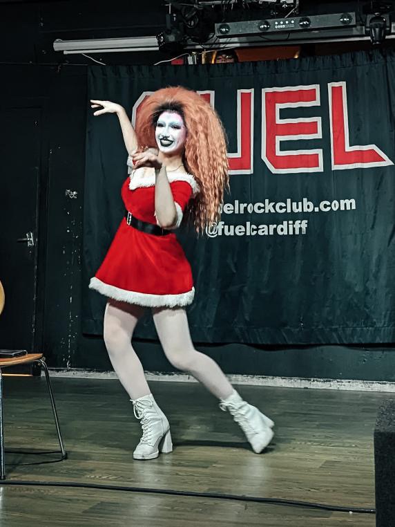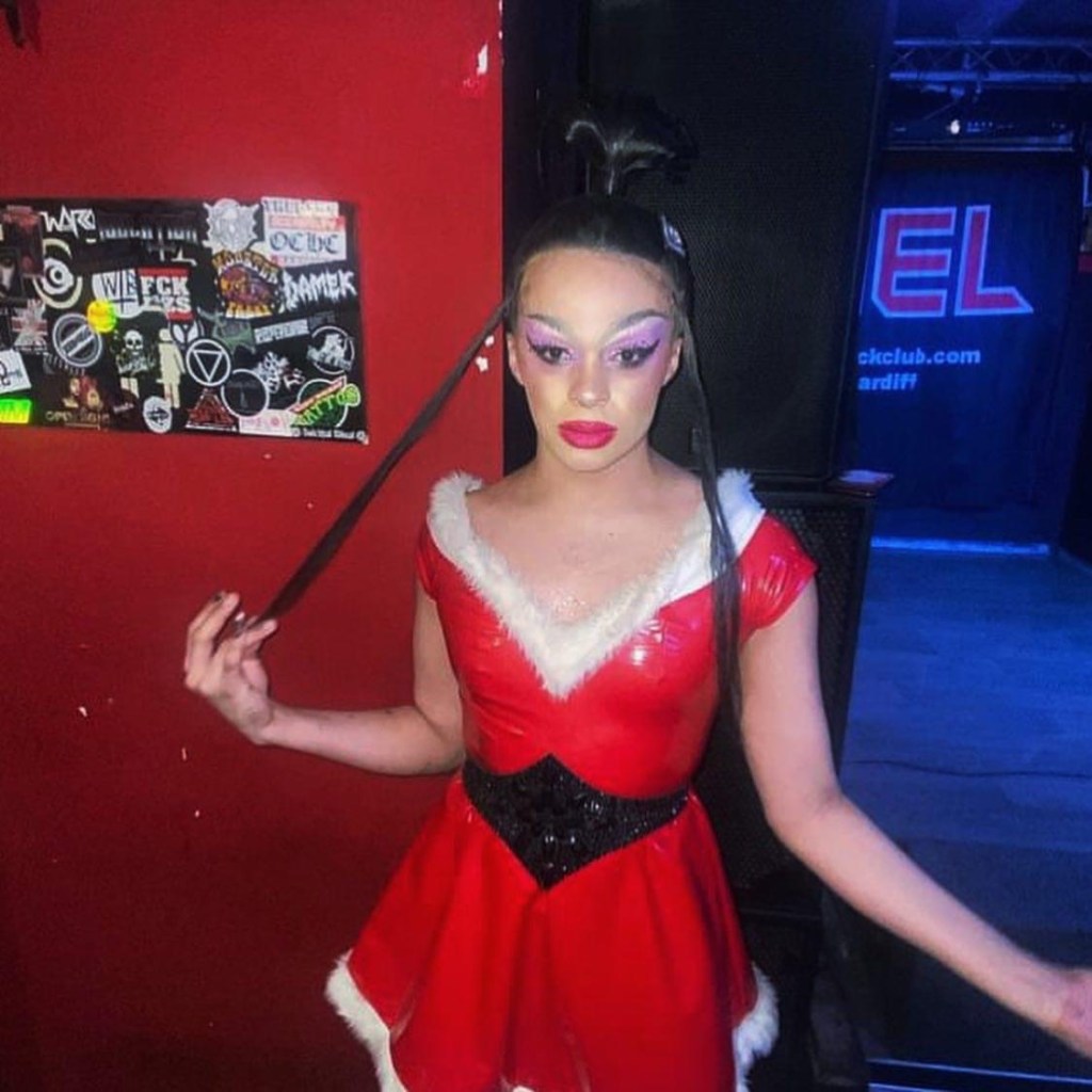 If you are in any way shape or form connected to the drag scene here in Cardiff then you will would have at least heard of the incredible Anniben. They are the alternative drag clown that is taking the drag scene by storm and in fact, if you have watched our recent interview with Tik Tok icon Catrin Feelings (which you can watch at https://youtu.be/kNcQ0CmlvgE?si=i9qjtuD3X9sKgBdd) talked about how talented the aforementioned self-confessed drag clown truly is! With all this hype being built up over many months I was concerned that Anniben would not meet the excitement but I could not have been more wrong! I actually think they surpassed the already extremely high expectations which is no easy feat! After appearing as a hostage Santa during AliBama’s act, Anniben graced the stage in his festive attire and delivered a unique drug-fuelled, frantic Santa routine where they performed with every fibre of their being. It is clear that Anniben is a very talented performer as they utilise every part of their body from facial expressions, to how they stand/move around the space to the placement of their hands to create an incredible and engaging performer. This track transitioned into the iconic “Rush” by Troye Sivan as Santa discovered poppers. At this point, Anniben revealed the words naughty boy blazen across his chest, went into the audience and danced with selected audience members (which I was lucky enough to be one of!) This routine came to an end with a series of tricks including a death drop which the audience went absolutely crazy for! The entire performance was clearly very well thought out which made for a very exciting and engaging act for the audience to witness!