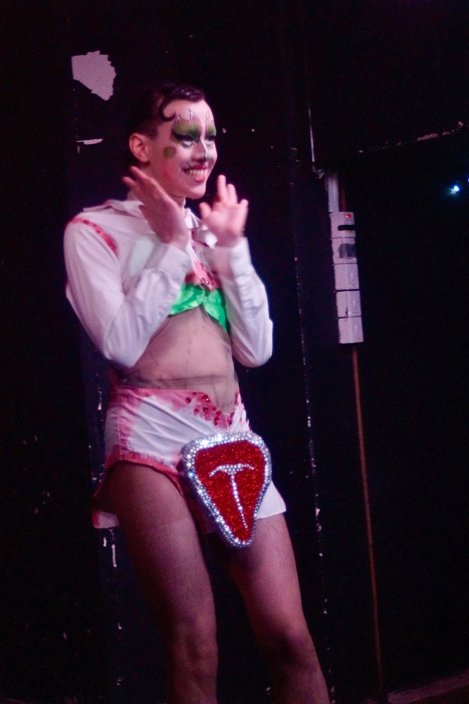 The first iteration of Cabaret of queerosities (which you can read about at https://rhysreviews.com/2023/12/26/cabaret-of-queerosities/ saw Anniben take to the stage and showcase a unique drugged-up version of Father Christmas as they sprinted around Fuel’s performance area. As a matter of fact, we were actually lucky enough to chat with Anniben after the event to chat about the inspiration for this performance which you can watch at https://youtu.be/R4huS0YgI0w?si=PQlTYQYEljRxRuto. This time however they decided to go even more outlandish with a narrative of falling in love with items of clothing. A booming voice echoed around the venue to inform the audience that the artist known simply as Anniben had fallen into despair and began developing feelings for their undergarments. This unusual breaking news style bulletin was a fabulous inclusion as it hinted towards what the audience were about the witness but nothing could prepare them for what was actually sent! This led to a brilliant moment in the act where Anniben revealed a mask, adored with said items of clothing, and unapologetically showed everyone how they felt. This escalated as cream was introduced and smeared over Anniben (and the stage itself) which obviously represented to intense feelings they had towards the clothes. You never truly know what to expect from an Anniben but it is always highly entertaining and a spectacle to watch! We could not be more excited for Anniben’s original show “Altered States” to land at Wales Millenium Centre on … and if you are interested to catch the show you can do so at https://www.wmc.org.uk/en/whats-on/2024/altered-states