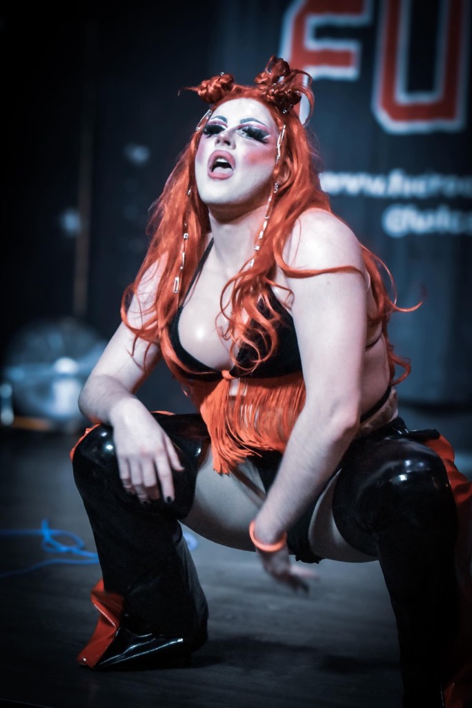Also making their debut on the Hell Haus stage is none other than everyone’s favourite sexy house wife AliBama. We were first introduced to this performer a year ago when they performed an emotionally powerful spoken word piece about their own gender journey (which you can read about at https://rhysreviews.com/2023/02/19/transition-2-event-review/) and the growth since this first performance has been absolutely mind blowing! In there section of the evening. The audience were treated to a wonderful rendition of ‘hot and cold’ by Katy Perry which provided an opportunity to AliBama to really flex their over-acting and comedy skills throughout. They owned every inch of the stage and the audience pit as they showcased their unique brand of comedy and high energy choreography. This was a very entertaining performance that had the audience laughing thought out! In the hate section of their performance AliBama decided to perform “what do you want from me” by Pink which appeared to be a very personal song for the performer. This would have to be my favourite performance of their set as AliBama seemed to pour absolutely everything into the performance leading to a highly emotional rendition of this song.