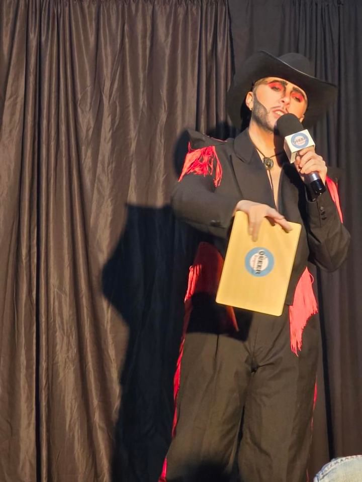 Making their debut at Transition was the wonderful Wan Long Cok who is a drag king who came out of the Drag King Collective workshop (which you can learn more about at https://www.instagram.com/welshkingcollective?igsh=MTVsNDhndnYxdHQzeQ==) What I thought was particularly fascinating about this performer was the fact that they are a very exaggerated and over the top character which influenced every single moment they were on the stage. The self-dubbed “chicken seller by day and coloniser dominator by night” is a larger-than-life persona who is inspired by the performer’s Asian heritage. Their set began with Wan walking through the audience in a wonderful kimono and laughing confetti over the audience as they walked past. This entrance fits the characters themselves perfectly and showcases the importance of their Asian heritage. This then set them to transition into a highly impactful and sensual dance routine when the performer finally reached the stage. Immediately after this, Wan delivered a very powerful speech about racial inequality with a focus on the conflict currently taking place between Palestine and Israel. Seeing this over-the-top character take on such an intense and political issue doesn’t seem they could co-exist but by the end, the audience was chanting along with the performer!