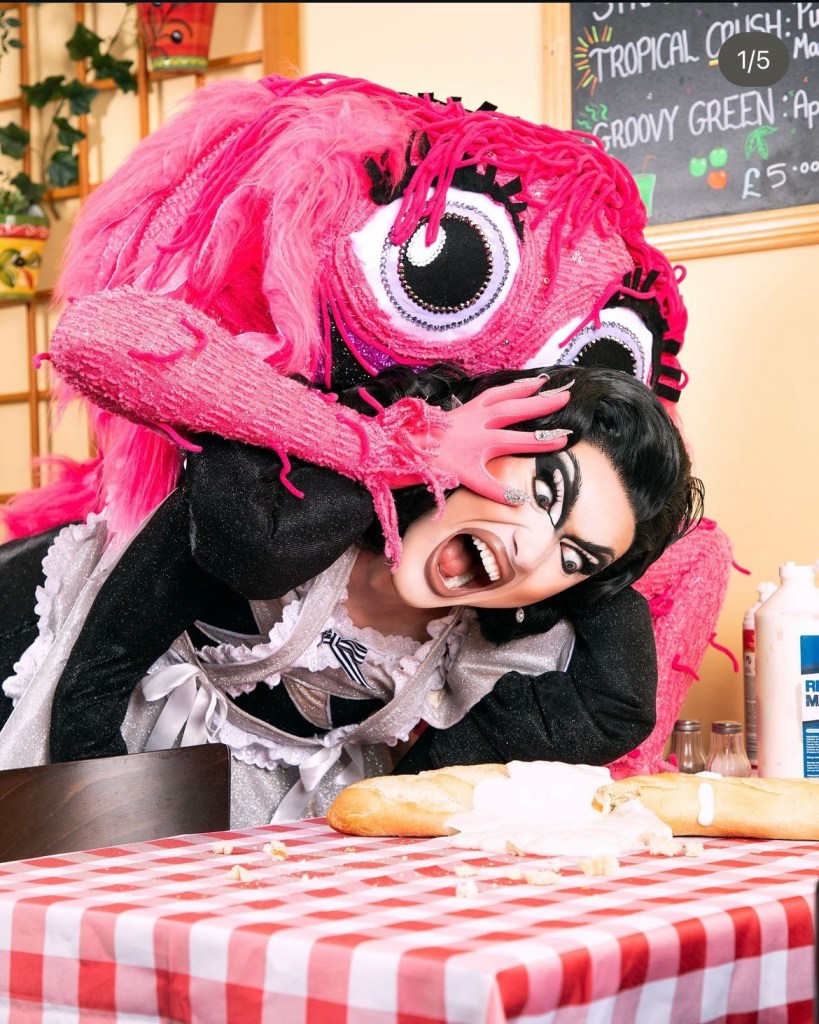 The most eccentric performance of the evening however came from Kyran as they graced the stage dressed as a waitress with a cartoon-esque monster on her back. They then launched into a sort of waitress-style tutorial but as the number progressed Suzy (the monster) became more and more unhinged and began covering the waitress with Mayo and wine which was absolutely crazy! This was also not what I would have expected from this queen and so I am also excited to see what other skills they may have hidden thus far!