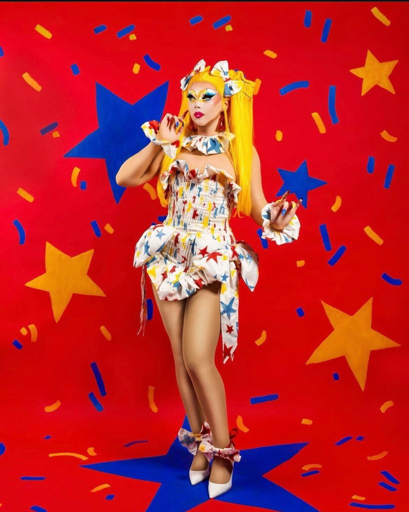 The next queen to enter the werk-room actually came from my hometown of Wales which obviously I think is absolutely amazing! Not only is it fantastic to see my country being showcased on the big screen but Actavia took this one step further by using her entrance sequence to share a short example of the Welsh language. Many people may not be aware that the use of the Welsh language is very decisive in Wales and in fact, many people would classify the national language of Wales as a vulnerable/endangered language so having mainstream representation can only help promote/protect the language which is obviously fantastic! The twenty-two-year-old, dancing diva decided to showcase an incredible black and white /nude bodysuit (which I assume is a reference to Drag Race double double entendre) with wonderful red details including gloves and a wonderful train following behind her. One of the most shocking inclusions to this iteration of Drag Race UK was the iconic La Voix who walked into the season as a very extremely established queen who seems to constantly be touring the UK. In fact, we have been lucky enough to see La Voix perform live in Cardiff twice (which you can read about at https://rhysreviews.com/2022/02/20/la-voix-performance-review/) which was extra special because during the first of these shows the icon La Voix was kind enough to bring my Aunty onto the stage to help celebrate her 65th birthday which made for a truly special experience! It is painfully clear that La Voix wanted to make sure that from the moment she entered the room, everybody knew exactly who she was as she walked in wearing her classic redhead and a stunningly gorgeous gown. I know that if I was one of the queens in the werk room and I saw this cabaret legend walk into the competition I would have been instantly intimidated due to how much of a name they have behind them! In an unusually coincidental twist, the next queen to walk in was also that I know fairly well! It has been heavily rumoured for a long time that Marmalade (who I recently sat next to on the judging panel of Jolene’s drag race which you can read about at https://rhysreviews.com/2024/08/13/jolenes-drag-race-week-three/) would be appearing on this season but the crowd at Mary’s went absolutely wild when they saw the familiar face on the screen! Some people may not be aware but Marmalade belongs to the same drag family as some of the UK icons such as the winner of Drag Race UK vs the World season two Tia Kofi and the incredible Victoria Scone (who we saw perform at Glee Club which you can read about at https://rhysreviews.com/2022/03/01/victoria-scone-production-review/#:~:text=Overall%20this%20was%20an%20extremely,incredibly%20affordable%20show%20to%20watch!) both of which have done incredible things within the franchise so the bar is set very high! What is particularly incredible about Marmalade being on this show is the fact that they are known for being an insanely talented self-taught seamstress and have made the majority of her outfits for this season! She entered the werk room in a gorgeous blue and pink ensemble which was a clear reference to her burlesque background.