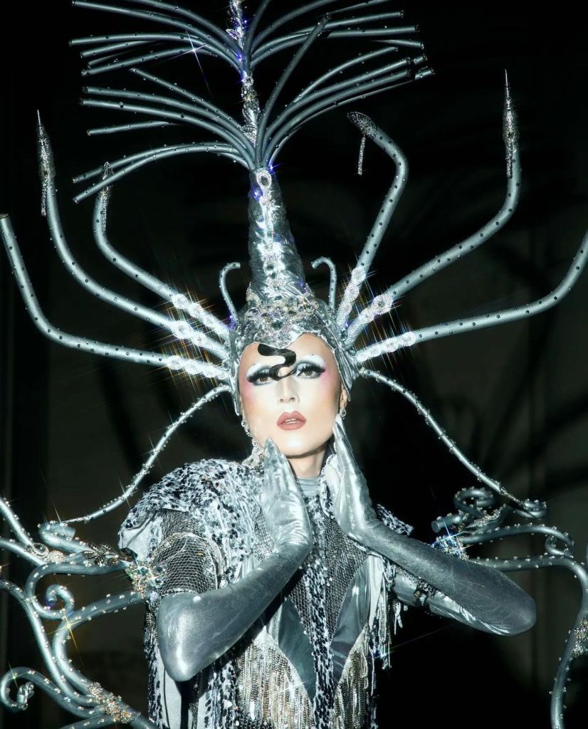 I have to say that Lill’s Life and Death runway presentation was my favourite look she had showcased this entire season! She wore the most gal outputs velvet dress with gold centipedes scattered across her body which was very on brand for her but also looked fantastic on her. To hit the category Lill showcased this unique gold, heart-shaped headpiece which helped to showcase her incredible makeup skills wonderfully! Having seen La Voix perform live on two separate occasions, I have seen them showcase a collection of classically glamorous looks and dress section of this look was much more of that style of drag but with a vibrant, colourful, carnival-inspired twist. It was the headpiece of this look however that was a highlight for me (which obviously is the intention of this runway category) with this immense feather headpiece was absolutely stunning!
