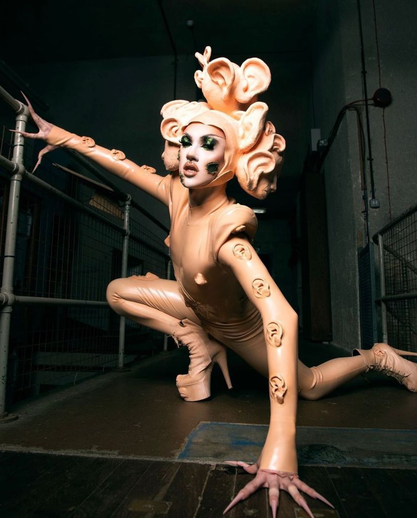 It has been clear throughout this season that Kyran Thrax has a very unique perspective on drag as every week they opted to go in a completely different direction to the other queens and yet always look absolutely amazing. Going for a much more alien/futuristic style presentation, Kyran showcased a unique skin-toned catsuit that had 3D recreations of her face scattered all over which was totally different to everything else we saw on this runway.