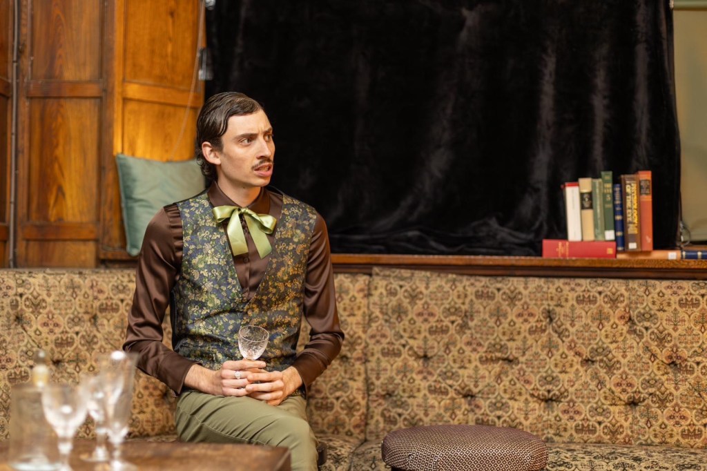 Taking a page from his own involvement in the Sly fundraising drag show at Cardiff University’s Student Union (which you can read about at https://rhysreviews.com/2024/05/01/sly-production-review/) Josh Salisbury was a major part of this production both on and off stage. Bring to life the distinctly different Uncle Fermin and the eccentric Aunt Agatha (but more of those later), he also took on directorial duties which showcased an immense amount of creativity and talent as he was not only able to construct the world of Dorian Grey but was also able to play within it himself! Tackling even one of these prominent roles would have sent me into a spiral but Josh seemed totally and ease and at home balancing these very different aspects of performing. As Uncle Fermin, Josh seemed totally at home and at ease with this historically accurate portrayal with the complex language patterns appearing natural and authentic. The injection of the charismatic performer came at the perfect time in the show as the audience was instantly captured and was left on the edge of their seats as to how the inclusion of the story would affect the rest of the ensemble on stage. It was the second of these iconic performances however that truly established Josh as a versatile actor as he returned (in drag) to play the wonderfully eccentric Aunt Agatha. While maintaining a sense of the authentic vernacular, Josh was able to have the audience in fits of laughter at the perfect time as an almost caricature of aristocratic women at the time whom the audience could not take their eyes off of!